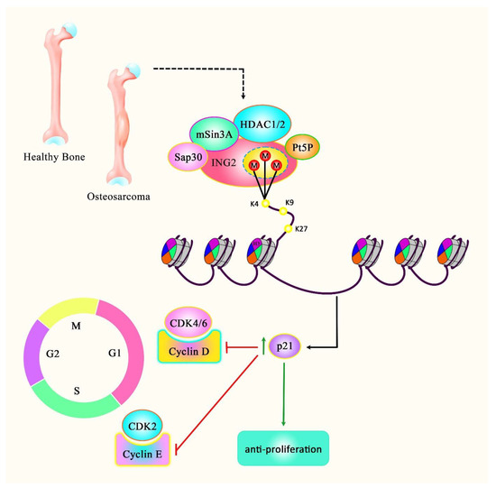 A schematic diagram of the ING2 protein involved in osteosarcoma. Accumulating evidence has detected that ING2 could contribute to enhancing apoptosis, G1 phase arrest, and senescence. Current research has demonstrated that ING2 acts as a tumor suppressor in osteosarcoma via modulating cell cycle progression and cell proliferation [32].