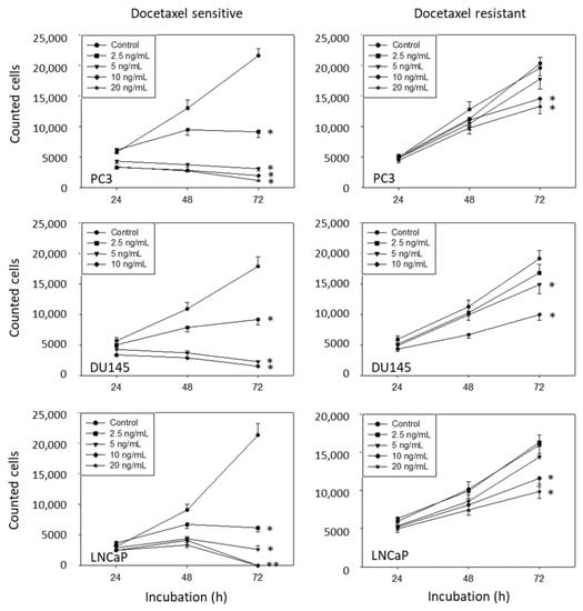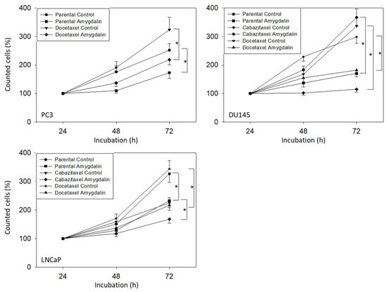 Figure 2. Influence of amygdalin on the growth of parental, cabazitaxel- and docetaxel-resistant PC3, DU145, and LNCaP cell lines. Cell count is related to the 24 h value set to 100%. Error bars indicate standard deviation (SD), n = 5. * indicates significant difference to the corresponding non-treated control.