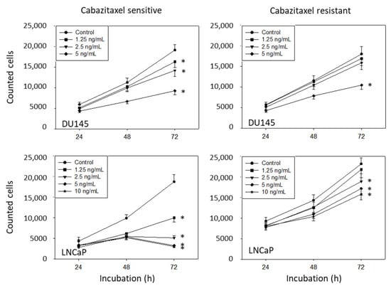 Figure 1. Dose–response analysis of sensitive and drug-resistant prostate cancer cells. Growth of cabazitaxel-sensitive versus cabazitaxel-resistant cells has not been evaluated on PC3 cells. Error bars indicate standard deviation (SD). * indicates significant difference to the corresponding control, n = 5.