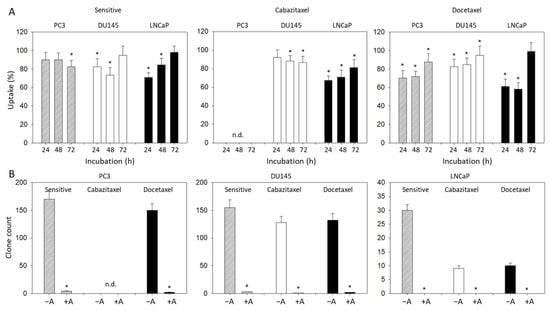 Figure 3. (A): BrdU uptake in sensitive and drug-resistant PC3, DU145, and LNCaP cells following amygdalin exposure for 24, 48, and 72 h. Values are given in percentage and are related to untreated controls, which were set to 100%. (B): Number of PC3, DU145, and LNCaP clones (drug-sensitive, cisplatin-resistant, and gemcitabine-resistant) exposed to amygdalin (+A), compared to the nontreated controls (−A). Error bars indicate standard deviation (SD), n = 3. * indicates significant difference to untreated controls. n.d.: not done.