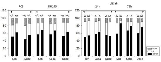 Figure 4. Cell cycle distribution in drug-sensitive and drug-resistant PC3, DU145, and LNCaP cells following amygdalin exposure (+A) for 24 (all cell lines) and 72 h (LNCaP cells). Controls (−A) remained untreated. One representative of three separate experiments is shown (n = 3).