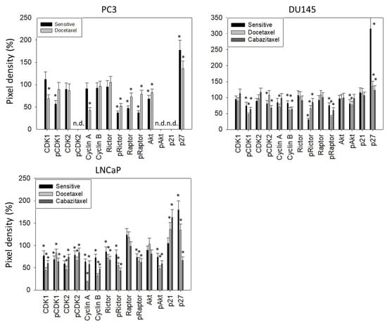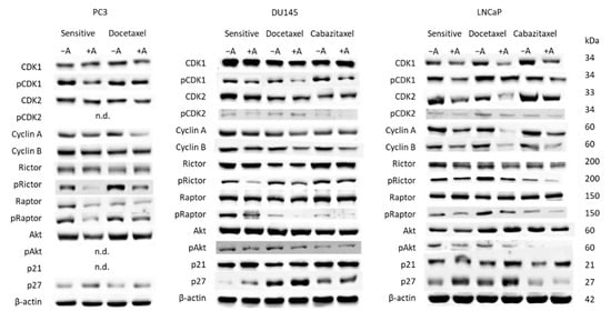 Cell cycle regulating proteins were analyzed thereafter (Figure 5). Concerning PC3 cells, the following proteins became downregulated by amygdalin: CDK1 (docetaxel-resistant cells), pCDK1 (sensitive cells), CDK2 (docetaxel-resistant cells), Cyclin A (docetaxel-resistant cells), pRictor, Raptor, pRaptor, and Akt (sensitive cells > docetaxel-resistant cells). In contrast, p27 was upregulated by amygdalin in sensitive as well as in the resistant tumor cells. pCDK2, pAkt, and p21 were not detectable in PC3 cells.