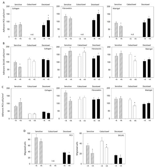 Figure 6. Adhesion of drug-sensitive and drug-resistant PC3 (A), DU145 (B), and LNCaP cells (C) to immobilized collagen, fibronectin, or matrigel. Tumor cells were either treated with amygdalin for 24 h (+A) or remained untreated (−A). (D) Effect of amygdalin (+A) on chemotactic migration of PC3 and DU145 cells. Controls were without amygdalin (−A). Bars indicate standard deviation (SD). * indicates significant difference to the corresponding control. n = 5. n.d.: not done.