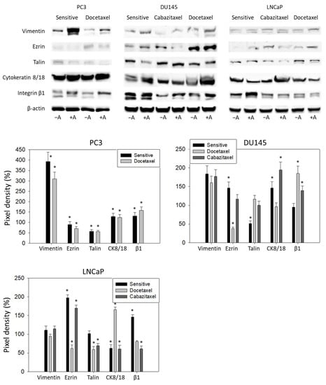 Amygdalin distinctly elevated the vimentin protein level in PC3 (both sensitive and docetaxel-resistant) and DU145 cells (sensitive, cabazitaxel-resistant, and docetaxel-resistant). The same effect was seen in docetaxel-resistant LNCaP cells (Figure 7). Ezrin was diminished in the sensitive and docetaxel-resistant PC3, and in cabazitaxel-resistant DU145 and LNCaP cells. However, Ezrin was elevated in sensitive DU145 and LNCaP as well as in the docetaxel-resistant LNCaP cells upon amygdalin treatment. A decrease in talin was observed in the sensitive and docetaxel-resistant PC3, in sensitive DU145, and in cabazitaxel- and docetaxel-resistant LNCaP cells. The intermediate filament cytokeratin 8/18 was found to be upregulated by amygdalin in PC3 (sensitive and docetaxel-resistant), sensitive and docetaxel-resistant DU145, and cabazitaxel-resistant LNCaP cells. However, it was downregulated in sensitive and docetaxel-resistant LNCaP cells. Finally, integrin β1 was enhanced in PC3 (sensitive and docetaxel-resistant), cabazitaxel- and docetaxel-resistant DU145, and sensitive LNCaP cells.