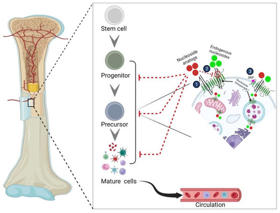 Anticancer drugs should ideally target cancer cells while avoiding normal cells, including cells in the bone marrow, but this is often difficult to accomplish and remains a major challenge in developing effective therapies. It is possible that anticancer nucleoside drugs can affect mature blood cells or their precursors or progenitors all the way up to HSCs. However, regarding hematopoietic toxicity, the function of the progenitors is far more important, as HSCs are mostly quiescent and often unaffected by the drugs. This is one major reason why leukemic cancer cells can be difficult to treat; progenitors are reached but HSCs (or leukemia stem cells) escape the treatment effect. Whether crosstalk exists between HSC involvement and hematopoietic progenitor regeneration after drug-induced myelosuppression remains less clear. Numerous correlative studies have associated the role of nucleoside transporters with nucleoside analog toxicity on hematopoietic cells; however, evidence for whether nucleoside transporters are a direct determinant of hematological toxicities remains vague. A key likelihood is that, because nucleoside transporters (NTs) are important for the cellular uptake of nucleosides and their corresponding anticancer analog drugs of this trait, they may also be involved in antimetabolite drug sensitivity in off-target sites, perhaps dysregulating the absorption of endogenous nucleosides [211]. Therefore, NTs can be a significant determinant for the toxicity of treatments for various cancers, such as gemcitabine chemotherapy, which is at least partially dependent on sodium-independent ENTs that are now known to play a role in hematopoiesis [212].