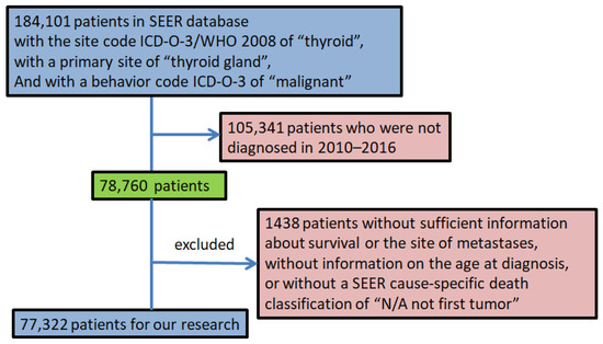 Selection criteria for this study included the following: (1) with primary TC; (2) diagnosed between 2010 and 2016. Patients lacking sufficient information on survival or metastases site, without information on the age at diagnosis, or without a SEER cause-specific death, were excluded from the study. Figure 1 shows the process of selecting patients.