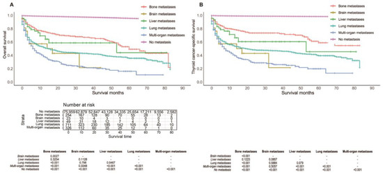 Kaplan–Meier curve of overall survival (A) and thyroid cancer-specific survival (B) according to the site of metastasis.