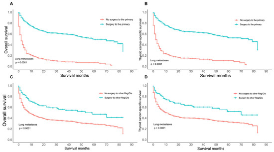 Kaplan–Meier curves of overall survival and thyroid cancer-specific survival according to whether or not surgery of the primary TC lesion and distant metastatic lymph nodes (LN) or lung metastasis was performed. (A) Overall survival for patients with isolated lung metastasis with or without surgery of the primary tumor. (B) Thyroid cancer-specific survival for patients with isolated lung metastasis with or without surgery of the primary tumor. (C) Overall survival for patients with isolated lung metastasis with or without surgery of the distant lymph nodes (LNs) or other metastatic sites. (D) Thyroid cancer-specific survival for patients with isolated lung metastasis with or without surgery of the distant lymph nodes (LNs) or other metastatic sites.