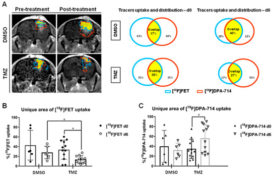 A volumetric analysis defines the distribution of tracers in the TME and highlights specific therapy-induced alterations in the uptake of individual tracers. (A) Representative CE-T1w images and single tracers VOI pre-and post-treatment in dimethyl sulfoxide (DMSO)- and temozolomide (TMZ)-treated groups. [18F]FET VOI (blue), [18F]DPA-714 VOI (red) and overlapping area (yellow) are schematically represented. (B) The unique area of [18F]FET and (C) [18F]DPA 714 tracer uptake volumes in DMSO- and TMZ-treated groups. The TMZ-treated group showed a decrease in exclusive [18F]FET VOI, in line with the anti-proliferative effect of TMZ while the unique [18F]DPA-714 VOI increased, triggered by increased immune cell infiltration in the TME after TMZ (* p < 0.05). Reproduced with permission from Foray et al., Theranostics, 2021 [26].