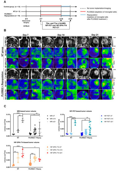 Monitoring glioma immunotherapy-induced changes after GAMs depletion and repopulation using multimodal PET/MRI. (A) Experimental workflow. (B) CE-T1w-MR and PET images for [18F]FET and [18F]DPA-714 of non-treated (NT) and PLX5622-treated animals, pre-, post-treatment, and after GAMs repopulation. (C) Volumetric analysis of CE-T1w- MR-, [18F]FET- and [18F]DPA-714-derived TV in NT, PLX5622-treated and repopulated groups. Repopulation (d14–d21) significantly reduced the progression of [18F]FET and [18F]DPA-714-based volume expansion while no significant difference was observed under CSF-1R inhibition-induced GAMs depletion (d7–d14). n = 3 NT; n = 15 PLX5622+repop. * p ≤ 0.05; ** p ≤ 0.01; *** p ≤ 0.001; **** p ≤ 0.0001. This research was originally published in JNM. Foray et al. Interrogating glioma-associated microglia/macrophage dynamics under CSF-1R therapy with multi-tracer in vivo PET/MR imaging. J. Nucl. Med. 2022; in press [37].