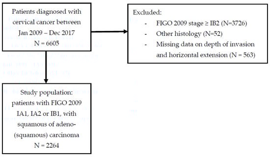 A total of 6605 patients were diagnosed with cervical cancer between January 2007 and December 2017 in the Netherlands. Of them, 2879 were diagnosed with FIGO 2009 stage IA1, IA2 or IB1; 52 were excluded because of non-squamous or non-adeno(squamous) histology, 563 were excluded because of unknown depth of invasion and unknown linear extension, resulting in a study population of 2264 patients (Figure 1).