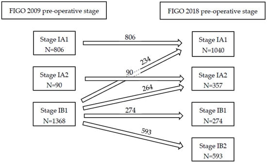 After reallocation to preoperative FIGO 2018 stage, the stage of disease changed in almost half of the patients with early stage disease (N = 1096). Twenty-six percent of patients were up-staged from FIGO 2009 IB1 to FIGO 2018 IB2; whereas 22.1% of patients were down-staged from macro-invasive (IB1) towards micro-invasive disease (IA1 or IA2), as is illustrated in Figure 2. Baseline and clinical characteristics of patients who were down-staged (IB1 to IA1 and IA2) or up-staged (IB1 to 1B2) and patients who remained the same stage (IA1 and IA2, and IB1 respectively) are presented in Table 2.
