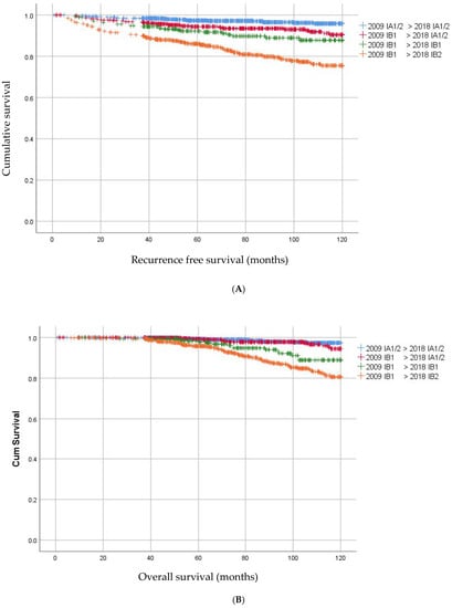Follow up was at least three years after surgery, with a median follow up of 83 months (IQR 57–111 months). Within follow up, 151 (6.7%) patients developed a recurrence; 3.4% local, 1.0% locoregional and 2.3% distant (with or without locoregional), with a median time to recurrence of 22 months. Recurrences occurred significantly more often in patients with macro-invasive, thus the depth of invasion > 5 mm, (FIGO 2018) disease than in women with FIGO 2018 micro-invasive disease (HR 3.85, 95% CI 2.85–5.20, p < 0.01). Women who were up-staged from IB1 to IB2 had significantly more recurrences than patients with a tumor less than 2 cm who remained IB1 (HR 2.02, 95% CI 1.32–3.10, p < 0.01) (Figure 3B).