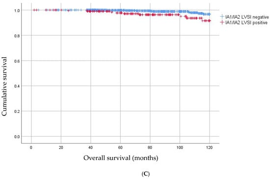 (A) Kaplan–Meier curves for overall survival in patients with change in FIGO stage. (B) Kaplan–Meier curves for recurrence free survival in patients with change in FIGO stage. (C) Kaplan–Meier curves for overall survival in patients with IA1/2 without LVSI and IA1/2 with LVSI.