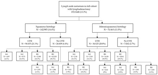 In 1448 patients a lymphadenectomy was performed and 13.3% (N = 193) of patients showed lymph node involvement (LNM). Lymph node involvement according to histology, LVSI and FIGO stage 2018 are illustrated in Figure 4. The risk of lymph node involvement for FIGO stage 2009 IB1 -> 2018 IA1/2 was 4.8% (24/501), and this was significantly higher than FIGO stage 2009 IA1/2 with LVSI (1 LNM in 80 patients, 1.25%, p < 0.05). Furthermore, the risk of lymph node involvement for FIGO stage 2009 IB1 > 2018 IA1/2 was significantly higher when LVSI was present compared to negative LVSI 12.7% (N = 16/126) versus 2.1% (N = 6/292), p < 0.05). There was no difference for risk of lymph node metastases in this group for <3 mm versus 3–5 mm invasion (3.4% versus 6.0%, p = 0.21). As shown in Figure 3C, patients with IA1 or IA2 with LVSI were significantly more prone to LNM than patients with IA1 or IA2 without LVSI with a HR 3.36 95% CI 1.33–8.64; p < 0.01.
