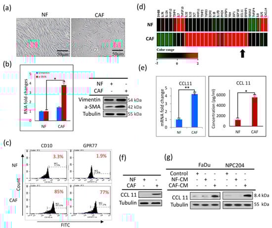 A panel of CAFs and NFs was generated with specimens from 10 patients with HNC (see Table A1). CAF and NF samples were dissected, isolated, and prepared from HNC patients who underwent surgical resection. Morphological observations demonstrated that CAFs present with more cytoplasmic protrusions than the relatively uniform NFs (Figure 1a). A higher expression level of vimentin and α-SMA was found in CAFs than in NFs, determined using RT-PCR and Western blot analysis (Figure 1b). Flow cytometric analysis showed a marked increase in the activity of CD10 and GPR77 (Figure 1c), which were characterized as essential cell surface markers of a CAF subset correlated with chemo-resistance and poor survival [29,30]. Furthermore, we performed a gene expression microarray study to compare their expression profiles. We focused on a group of secreted proteins, including chemokine-related and/or cytokine-associated genes, which were significantly up- or down-regulated (≥4-fold) in CAFs compared to NFs. Among these, CCL11 expression was significantly higher in CAFs than in NFs (Figure 1d); this finding was also confirmed by RT-PCR and ELISA analysis (Figure 1e). Western blot analysis also showed CCL11 overexpression in CAF, compared with that in NF in cell lysates (Figure 1f). Moreover, administration of CAF-conditioned medium (CAF-CM) to FaDu and NPC204 cells, compared to NF-conditioned medium (NF-CM), induced a higher CCL11 expression (Figure 1g). Collectively, these results showed that CCL11 was overexpressed in CAFs, implicating that CCL11 was associated with CAF-induced cancer behaviors.
