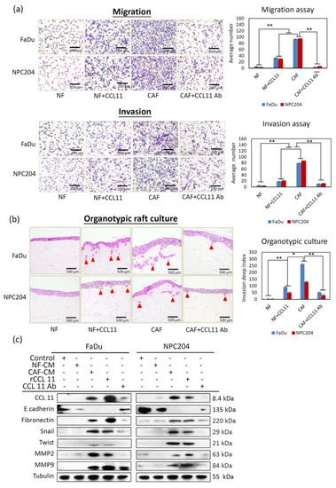 In vitro transwell migration and invasion assays were performed. FaDu or NPC204 cells were suspended in culture medium containing 0.5% serum, and then plated in the upper chamber. In the invasion assay, a Matrigel–medium (1:2) mixture was applied onto the membrane of the upper chamber before seeding the cancer cells. Following 12 and 24 h of incubation for the migration and invasion assays, respectively, cells on the upper side of the filter were removed, and migratory or invasive cells were fixed in 4% formaldehyde before staining with the hematoxylin. The number of migrated/invaded cells was counted using light microscope. In the co-culture migration/invasion assays, CAFs or NFs were seeded on the outer chamber prior to the FaDu and NPC204 cells and then incubated for 24 h. The growth medium was then replaced with medium with or without an anti-CCL11 antibody. For CCL11-induced migration/invasion assays, rCCL11 protein (10 or 50 ng/mL; MBS142051, MYBioSource) was added to the lower chamber. Then, the assay was performed according to a standard migration/invasion protocol. Three independent experiments were conducted, and data were shown as mean ± SD.