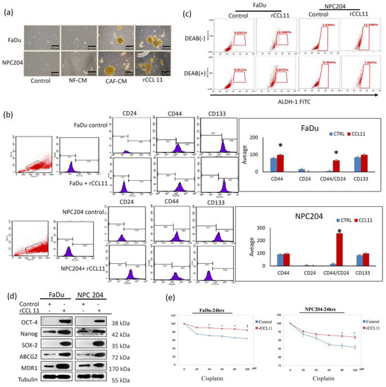 To understand the CCL11-mediated crosstalk between cancer cells and CAFs at the molecular level, we investigated if the paracrine effects of CCL11 effect the expression of the CSC-like properties of HNCs. The effects of CAF-induced CCL11 on the ability of sphere formation, the expression of CSC-like properties, and the expression of CSC-representative markers were first examined. A non-adhesive sphere culture system was used, and the result showed that HNC cell lines exposed to rCCL11 and CAFs-conditioned medium initially generated immature, floating spheroids in the first 3–5 days, which further gradually transformed into well-formed spheres at day 7. However, control cells yielded only an irregular small cell mass without the spheroid appearance (Figure 3a). Flow cytometric analysis showed significantly higher CD44/CD24 and CD133 in HNC cells exposed to rCCL11, compared with control HNC cells (p < 0.05) (Figure 3b). Moreover, the fluorescence level of ALDH1 obtained through FACS analysis was higher following treatment with rCCL11 in both HNC cells (Figure 3c). Western blot analysis showed that other CSC-representative markers, including OCT4, Nanog, and Sox-2, were also overexpressed in HNC cells exposed to CCL11 compared to control HNC cells. Drug resistance-related gene expression was also tested in HNC cells. Western blot analysis showed that CCL11 was also involved in ABCG-2 and MDR-1 upregulation (Figure 3d). Chemoresistance treated with Cisplatin was also significantly enhanced in both FaDu and NPC204 cells exposed to rCCL11 (Figure 3e). Collectively, these results indicate that cells exposed to CCL11 through paracrine signaling enhance representative CSC properties and drug resistance.