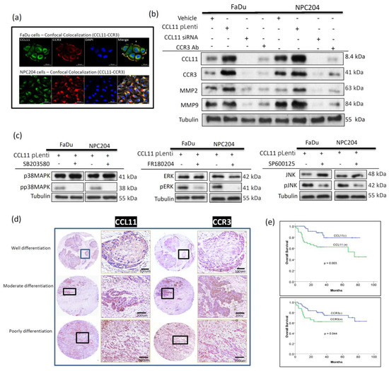 CCL11 and CCR3 expression with associated signal pathway in HNC cell lines and their correlation to clinical outcomes in 104 HNC patients. (a) Confocal microscopic images showed CCL11 (green) localized to both cell and nuclear membranes, while CCR3 (red) localized only to the cell membrane in FaDu cells; CCL11 and CCR3 co-localized at the cell membrane (yellow). In NPC204 cells, CCL11 (green) and CCR3 (red) were found to co-localize at protrusions polarized to the cells (yellow). (b) Using the crisp technique, higher expression of CCR3, MMP2, and MMP3 was found in over-expressed CCL11 cloned-FaDu and NPC204 cells. Cloned CCL11-overexpressed cells were abolished by adding eotaxin siRNA or CCR3 antibody, which reversed the expression of CCR3 and invasion-related MMP2 and MMP9. (c) Higher phosphorylation levels of p38 MAPK and ERK were found in cloned CCL11-overexpressed FaDu and NPC204 cells and were reversed by treatment of the p38 MAPK inhibitor (SB203580) and ERK inhibitor (FR180204), respectively. The phosphorylation level of JNK was kept in low condition before and after treatment of the JNK inhibitor (SP600125). (d) Photomicrographs of immunohistochemical staining from tissue microarray showing CCL11 and CCR3 expression in three different representative groups of HNC patients (magnification, ×200). (e) Kaplan–Meier survival analysis of patients showed that overexpression of CCL11 and CCR3 were statistically associated with poor overall survival).