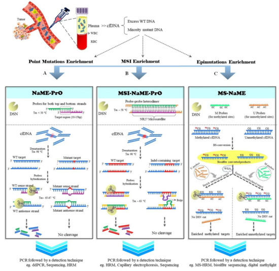 Microsatellite instability (MSI) refers to frequent indels within repetitive genomic sequences, resulting from deficiencies in cellular DNA mismatch repair [65]. Tracing MSI in cancer patients has been accentuated because of its roles in diagnosis, prognosis, and personalized therapy [66]. Sensitive MSI detection methods via liquid biopsies are important for the genotyping of primary or secondary tumors when a tissue biopsy is not clinically available. MSI-NaME-PrO, a modification of NaME-PrO, is a pre-PCR enrichment method that traces MSI (Figure 1B). MSI-NaME-PrO removes unaltered micro-satellite targets using probes for multiple microsatellite sites simultaneously. Since MSI within target sequences induces ‘bulges’ between the probe–target hybrids, DSN does not efficiently digest target sequences containing microsatellite indels. Accordingly, MSI-NaME-PrO reduces false-positive results derived from polymerase slippage in homopolymer sequences, and improves indel detection sensitivity [67]. The data indicate the high sensitivity and specificity of combining MSI-NaME-PrO and capillary electrophoresis for detecting MSI at a frequency of ~0.01% in cfDNA samples from colorectal cancer patients [67].
