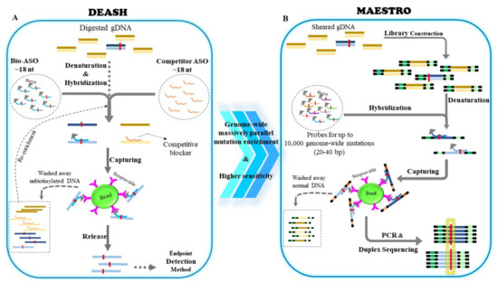 An alternative approach for mutation enrichment is the selective capturing of mutant alleles on a solid support instead of removing wtDNA through enzymatic reactions or UV-mediated cross-linking. In 2003, Jeffreys et al. [77] described a bead-based capturing technique for enriching known single-nucleotide variants via biotinylated allele-specific oligonucleotides. DNA enrichment using the allele-specific hybridization (DEASH) method can increase the frequency of mutant alleles prior to PCR (Figure 3A). DEASH is applied on restriction-endonuclease-digested dsDNA. Biotinylated allele-specific oligonucleotides (bio-ASOs) are employed to bind mutant alleles. The competitor ASO complementary to wtDNA, without a biotin tag, is also simultaneously used to improve the hybridization specificity. Following hybridization, the bio-ASO/target hybrids are captured using streptavidin-coated magnetic beads. Purified captured products can undergo further rounds of DEASH. This study reported that rare mutations of mutation allelic frequency ~10−3–10−5% could become detectable by applying DEASH prior to amplification. Although the originally described DEASH method was not applied on cfDNA samples, a recent development uses a modified DEASH principle to track thousands of low-level mutations in cfDNA. Minor-allele-enriched sequencing through recognition oligonucleotides (MAESTRO), employs short probes to capture up to 10,000 low-level mutations simultaneously, and then, incorporates duplex sequencing to detect mutation fingerprints in cfDNA for tracking minimal residual disease with high sensitivity and specificity (Figure 3B) [78].