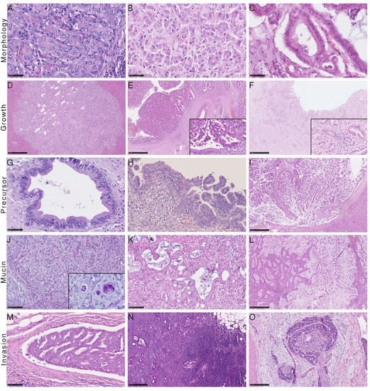 Histological distinction features of iCCA. (A) Adenocarcinoma forming solid sheets; (B) with cuboidal cells; (C) Infiltrative glands composed of prismatic cells. Different histological growth patterns of iCCA showing (D) a mass-forming (MF) tumor, (E) a tumor showing intraductal growth (IG), and (F) a tumor with periductal-infiltrating growth. Note the adjacent inconspicuous biliary epithelium (inlay; (E,F)). (G) Biliary intraepithelial neoplasia of low-grade and (H), 200X magnification) high-grade; (I) intraductal papillary neoplasm of the bile ducts. Different amounts of mucin: (J) little mucin with PAS-positivity showing in the inlaid picture; (K) moderate and (L) extensive amounts of mucin. (M) Lymphangioinvasion and (N) lymph node metastasis. (O) Perineural invasion.