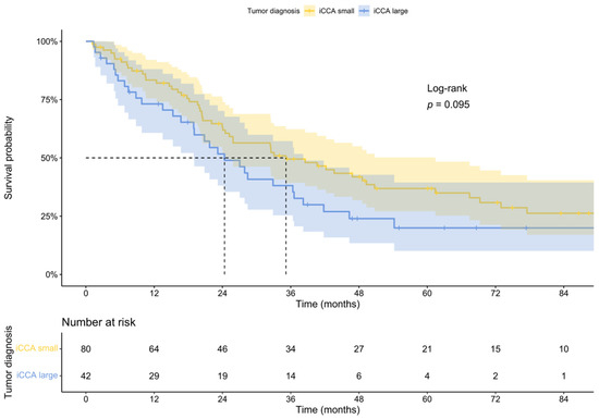 Survival probability of the small duct iCCAs was better than that of the large duct iCCAs. However, in contrast to previous findings [13], this result was not statistically significant. This may be a secondary effect due to the low number of patients, who were eligible for the survival analysis, especially regarding the period after 5-year survival, or a bias due to the fact, that in our study, only resectable iCCAs were included. The median overall survival was 24.37 months for large duct iCCAs, compared to 35.17 months for small duct iCCAs (Figure 3).