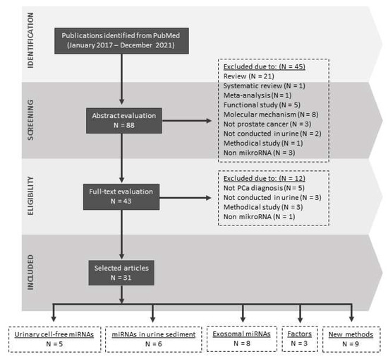 The first study reporting changes in miRNA concentration in the urine of prostate cancer patients was published in 2012. Bryant et al. have quantified selected miRNAs, of which miR-107 and miR-574-3p were present at significantly higher concentrations in the urine of men with cancer compared to controls [27]. These observations have led to growing interest and an increasing number of investigations in recent years. Currently, there are a considerable number of studies describing the importance of urinary miRNAs in prostate cancer diagnostics and management [28,29]. However, these studies often suffer from heterogeneity and inconsistency within the miRNA analysis process and thus the published data [30]. Undeniably, it is mainly because there is a lack of recommendations or guidelines for urine sampling and processing as well as for miRNA isolation and quantification [31]. Therefore, this review aims not only to summarize new knowledge in the field, but also to unveil whether these shortcomings were corrected. The study selection is illustrated in Figure 1.