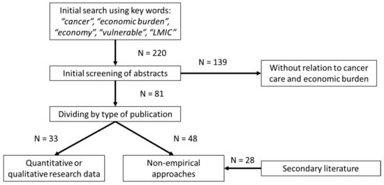 A literature search was conducted using the items “cancer”, “economic burden”, “economy”, “vulnerable” and “LMIC” (220 results). These publications were screened regarding the relationship to the UHC criteria, and papers without relation to cancer care and economic burden were eliminated (N = 139). The remaining papers (N = 81) were divided into a group containing quantitative or qualitative research data (N = 33) and publications focusing on non-empirical approaches (N = 48). In addition, secondary literature (N = 28) was used to supplement specific aspects of financial consequences (Figure 1).