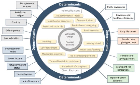 Direct and indirect reasons and determinants (grey: demographic; blue: economic; white: public; red: disease-related; green: social) of financial burden in vulnerable groups for cancer care.
