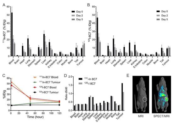 We previously showed that our ADAM10 monoclonal antibody 8C7 is specific for ADAM10, and that it recognises both human and mouse forms, reflecting their high homology; with 95% sequence conservation in the C domain and 100% sequence conservation of residues contacting the 8C7 complementarity-determining regions (CDRs) []. This cross-reactivity enables assessment of the relative binding of 8C7 to ADAM10 in tumour and normal tissue in mice with human tumour xenografts. We thus evaluated the biodistribution of mAb 8C7 in mice bearing human LIM1215 colon cancer xenografts, which we have previously shown to possess high levels of active ADAM10 []. 8C7 was conjugated to 111In (Figure 1A,C) or 125I (Figure 1B,C) and intravenously injected, and tumour and tissue samples were collected over 6 days and analysed for radioactivity. Both conjugates showed similar distribution profiles, with gradual clearance from the blood, and clearance from most tissues consistent with blood pool clearance, with no specific tissue uptake and retention. In comparison, antibody retention in the tumour was more prolonged, indicating preferential binding to tumour cells compared to normal organs (Figure 1C,D). The enhanced tumour uptake of 111In-8C7 compared to 125I-8C7 may reflect the known rapid internalisation of 8C7 [], as the Indium label is better retained under these conditions, while 125I is dehalogenated and diffuses out of the tumour cell []. SPECT/MRI imaging of 111In-8C7 2 days post injection also indicated preferential targeting of the tumour. The 111In-8C7 signal detected in liver and spleen was consistent with metabolism of the 111In-chelate in these organs, rather than with higher antibody retention (Figure 1D,E).