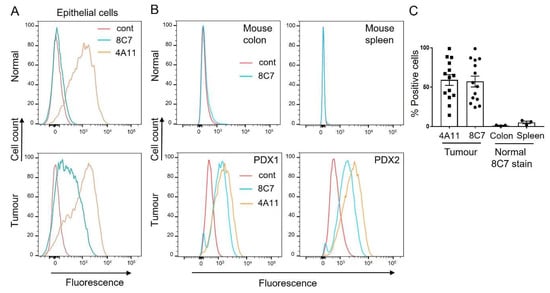 Anti-ADAM10 mAb 8C7 preferentially binds human colon tumour cells compared to normal cells. (A) Single cell isolates from colon tumour and matched normal patient tissue were stained with the anti-ADAM10 antibodies 8C7 and 4A11, and with antibodies against CD45 and EpCam, and analysed by flow cytometry. Histograms show normalised staining of epithelial cell populations (EpCam positive, CD45 negative). (B) Tumours were recovered from mice bearing two human colorectal PDX lines, and single cell isolates were stained with 8C7, 4A11 or control IgG, before analysis by flow cytometry. Normal colon and spleen were also analysed for 8C7 binding (human-specific 4A11 was not used). Histograms show overlaid binding of ADAM10 antibodies with an isotype control. (C) Quantitation of 8C7 binding to tumour cell isolates, from multiple passages of six distinct colorectal PDX tumour lines (n = 14 tumours), compared to normal tissue (% positive cells). Binding of the anti-human ADAM10 mAb 4A11 to PDX tumour cells is also shown for comparison.