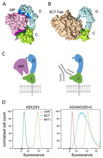 Binding of 8C7 to ADAM10 is sterically regulated by the metalloprotease domain obstructing the 8C7 epitope. (A) Crystal structure of the ADAM10 metalloprotease (MP), disintegrin (D) and cysteine-rich (C) domains []. (B) Crystal structure of the ADAM10 D and C domains in complex with the 8C7 Fab fragment []. (C) Cartoons of the structures in A and B, illustrating our approach to test whether removal of the MP domain allows binding of 8C7 to ADAM10, using ADAM10 D and C domains lacking the MP domain (ADAM10D + C), expressed on the cell surface. (D) HEK293 cells expressing endogenous ADAM10 were transfected with ADAM10D + C and compared to untransfected cells by flow cytometry for binding to the anti-ADAM10 mAbs 8C7 (blue) and 4A11 (yellow), or unstained cells (control, red). (A) and (B) were adapted with permission from Seegar et al., 2017, Cell [].