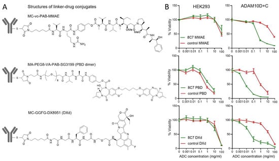Next, we generated 8C7 antibody–drug conjugates, by coupling 8C7 with the DNA binding cytotoxin PBD, the microtubule disruptor MMAE, or the Topoisomerase I inhibitor DXd (DX8591 derivative), all of which have been clinically tested with other antibodies [,]. The drugs were attached using a cleavable linker, enabling their release upon internalisation into cells. Linker-ADC structures are shown in Figure 4A. Flow cytometry analysis confirmed 8C7-ADCs retained binding to ADAM10D + C cells (Figure S2). We then tested the effects of the ADCs on the viability of ADAM10D + C cells and parental HEK293 cells expressing only endogenous ADAM10. All 8C7-ADCs were able to efficiently kill cells expressing ADAM10D + C containing the exposed 8C7 epitope, compared to the corresponding control ADCs (Figure 4B). In contrast, the parental cells were equally resistant to the control and 8C7-ADCs, confirming the selectivity of 8C7-ADCs. 8C7-PBD had the highest activity, consistent with the known potency characteristics of PBD dimers []. Similar to parental HEK293 cells, 8C7-ADCs were ineffective against LIM1215 colon and U251 glioblastoma (GBM) tumour cells expressing ADAM10 (Figure S3), consistent with the low binding of 8C7 to live cells in vitro [] compared to that in tumours, likely reflecting a predominantly inactive conformation on cells cultured in vitro [].