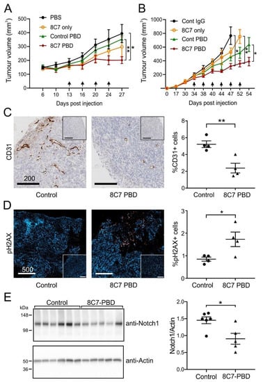 Finally, we evaluated 8C7-ADCs in mice bearing tumours. We concentrated on 8C7-PBD, which showed the highest potency in vitro. In addition to LIM1215 colon xenografts, we also used U251 glioblastoma (GBM) xenografts, since ADAM10 expression is associated with poor prognosis in GBM [], where it mediates Notch and other oncogenic signalling [,]. Mice treated with 8C7-PBD exhibited significantly inhibited tumour growth compared to those treated with vehicle or control IgG, and also compared to mice subjected to treatment with a control IgG-PBD conjugate (Figure 5A,B). 8C7-PBD was also more effective than naked 8C7 at >20-fold higher dose (p < 0.01 in GBM model, Figure 5B). Tumours from 8C7-PBD-treated mice showed decreased staining of the endothelial marker CD31, and increased staining for phospho-histone γH2AX, a marker for G2-M cell cycle arrest (Figure 5C,D, Figure S4A), known to result from PBD-induced DNA cross-linking []. These results are consistent with 8C7-PBD targeting a subpopulation of tumour cells with high Notch activity, that support angiogenesis [,]. Indeed, Western blot analysis of tumour lysates indicated decreased Notch 1 levels in 8C7-PBD-treated tumours, with the one outlier being the largest, most resistant tumour (Figure 5E). Mouse weights and overall health were not significantly affected, and were equivalent to control ADC, consistent with minimal binding of 8C7 to ADAM10 in normal tissues (Figure S4B). 8C7-PBD was also effective against a human colon cancer PDX model (Figure S5A). We also tested 8C7-DXd in mice bearing U251 tumours; this also effectively inhibited tumour growth while being well tolerated, with mouse weights being unaffected compared to control mice (Figure S5B,C).