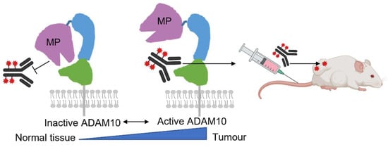 An alternative approach is to employ monoclonal antibodies, which have the advantages of high affinity, specificity and stability in vivo []. They can either be inhibitory (e.g., by competing with ligand or substrate binding), or induce cell death (by immune-mediated cell- or complement-dependent cytotoxicity, or by direct attachment of cytotoxic drugs) []. Antibody–drug conjugates (ADCs) are prominent amongst newly approved cancer treatments [,]. Clearly, these must preferentially target tumour antigens to avoid toxicity to normal tissues. While the wide expression of ADAM10 in normal tissues could undermine such an approach [], we previously showed preferential binding of our antibody, 8C7, to active ADAM10 which was upregulated in tumours compared to normal tissues, both in mice and in human samples []. We now support this with data from biodistribution studies of radiolabelled 8C7 in mice bearing human colorectal cancer xenografts, in which the mouse/human cross-reactive antibody preferentially accumulated in tumours compared to normal tissues. Furthermore, we show that the activity-dependent selectivity of 8C7 is likely due to conformational exposure of the 8C7 epitope in the C-domain of active ADAM10, which is obscured by the MP domain in the auto-inhibited conformation [], since removal of the MP domain facilitates robust binding of 8C7. While previous studies have indicated conformational changes upon activation of ADAM proteases [,,], and the ADAM10 crystal structure shows a ‘closed’ inactive conformation, with interaction of the MP and C domains likely causing steric hindrance of substrate binding [], this is the first direct evidence that movement of the metalloprotease domain allows access to a hidden epitope in the C domain recognized by 8C7. The selectivity of 8C7 for active ADAM10 in tumours [] is consistent with active ADAM10 having an open structure, allowing substrate and antibody access (Figure 6).