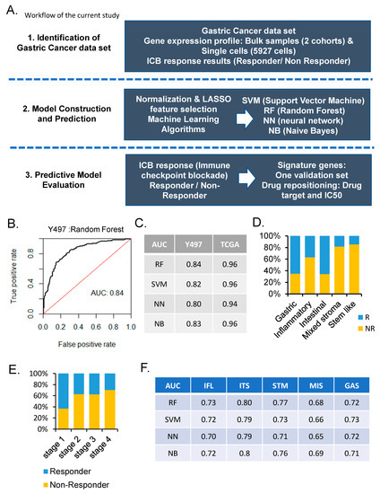 Machine learning predicts immune checkpoint blockade (ICB) response. (A) Overview of the study workflow and analysis pipeline. (B) Receiver operating characteristic curve of predictive performance on random forest in the Yonsei hospital cohort (Y497). (C) Performance comparison of classifiers in Y497 and the Cancer Genome Atlas (TCGA) stomach adenocarcinoma (STAD) dataset. (D) Bar graph of molecular subtype for ICB response in Y497 (Blue, R, responder; Yellow, NR, non-responder). (E) Bar graph of tumor stage of ICB response (Blue, R, responder; Yellow, NR, non-responder). (F) Performance comparison of classifiers in molecular subtype of Y497. Molecular subtype: IFL: Inflammatory, ITS: Intestinal, STM: Stem-like, MIS: Mixed stroma, GAS: Gastric.
