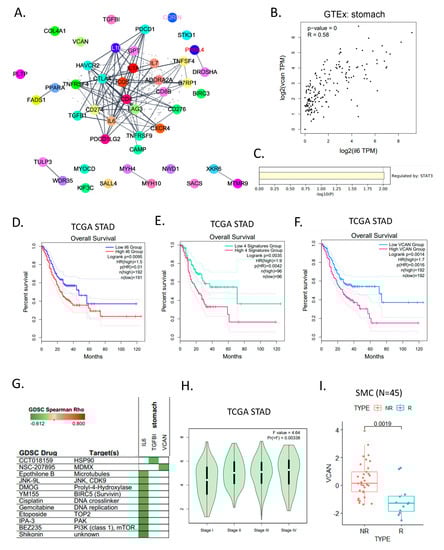 We confirmed the positive correlation (R = 0.58) between VCAN and IL6 from the stomach GTEx dataset (Figure 4B). The genes identified through the PPI network were regulated by a transcriptome factor called STAT3 (Figure 4C). To determine how these signature genes are clinically related to patient prognosis, we checked the TCGA STAD data set. A high expression of IL6 (Figure 4D), VCAN, and the top four signature genes showed a poor prognosis (Figure 4E,F). We compared drug sensitivity in GDSC for several drug target candidate genes. IL6 was highly sensitive to shikonin, BEZ235, and IPA-3, and VCAN was predicted to be sensitive to NSC-207895 (Figure 4G). We considered VCAN over IL6 as a candidate gene because, although it was not a PPI hub gene, it scored high in all four machine learning algorithms. The parameter selection function in LASSO regression improves prediction accuracy by lowering the regression coefficient. Using the LASSO feature selection method, we acquired a list of genes that were related to the categorization (Table S2). The VCAN gene had the highest coefficient value in the bulk RNA expression dataset when we evaluated the top ranked genes. VCAN expression in TCGA STAD data were compared for each stage and was highest in stage 4 (p = 0.00338) (Figure 4H). The actual ICB response data from the SMC indicated that VCAN was significantly high in the non-responder group (p = 0.0019) (Figure 4I). VCAN [32] is chondroitin sulfate proteoglycan core protein 2, a mesenchymal stem cell and lineage-specific marker that acts on chondroitin sulfate/dermatan sulfate metabolism, ERK signaling, and glycosaminoglycan metabolism.