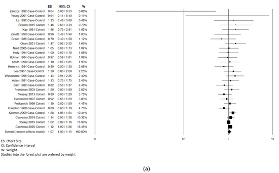 Twenty-six studies [13,15,20,22,23,24,25,26,29,31,33,37,39,40,41,42,43,44,45,49,52,53,54,55,56,65] included in the systematic review were used for the overall risk estimation of CMM (Table 1, Figure 2a). One study [47] was excluded as reporting SIR and no risk estimates. In the overall analysis, OC use did not significantly affect the risk of developing CMM. Stratifying the results by study design, the time since the most recent OC use, and status of use showed no significant association between the risk of developing CMM and OC use. The stratification by study design showed a significant association for cohort studies; the stratification by age at the first use showed a significant association for an age greater than 20 years old. Stratifying the analysis by melanoma morphology showed that OC use did not significantly affect the risk of developing SSM or NM. In the overall analysis, the risk of developing uveal/intraocular melanoma showed no significant association with OC use.