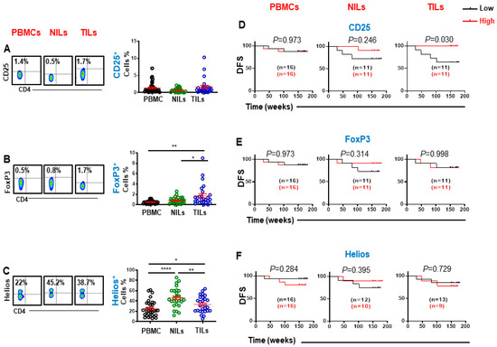 Flow cytometric plots, scatter plots and Kaplan–Meier survival curves for DFS based on the levels of CD25-, FoxP3-, and Helios-expressing CD3+CD4− T cells. Representative flow cytometric plots and scatter plots present CD25 (A), FoxP3 (B) and Helios (C) expression in CD8+ T cells in PBMCs, NILs and TILs. CRC patients with high levels of CD25 (D), FoxP3 (E) and Helios (F) expressing CD8+ T cells were compared with patients with low levels of these cells to determine DFS. The number of patients included in each comparison are specified on each survival curve. Statistical analysis are shown with significance levels indicated at * p < 0.05, ** p < 0.01, and **** p < 0.0001.