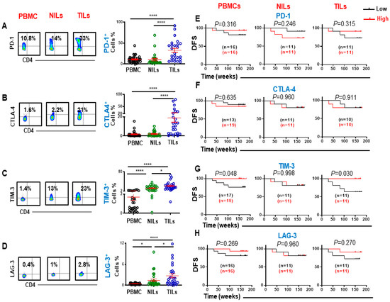 Flow cytometric plots, scatter plots, and Kaplan–Meier survival curves for DFS based on the levels of PD-1, CTLA-4, TIM-3, and LAG-3-expressing CD3+CD4− T cells. Representative flow cytometric and scatter plots present the levels of PD-1(A), CTLA-4 (B), TIM-3 (C), and LAG-3 (D) expressing CD8+ T cells in PBMCs, NILs, and TILs. CRC patients with high levels of PD-1 (E), CTLA-4 (F), TIM-3 (G), and LAG-3 (H)-expressing cells were compared with patients with low levels of these cells to determine DFS. The number of patients included in each comparison are specified on each survival curve. Statistical analysis are shown with significance levels indicated at * p < 0.05 and **** p < 0.0001.