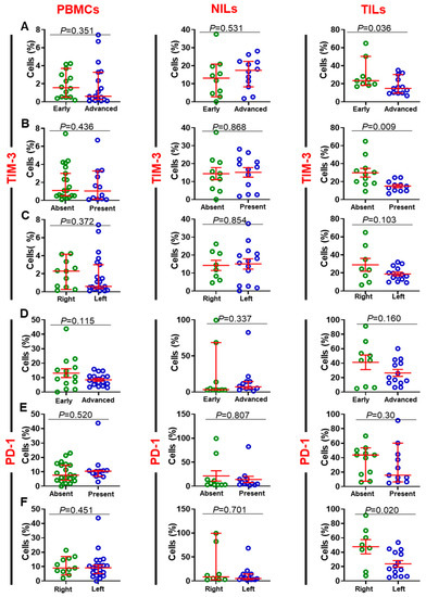 Comparison of TIM-3 and PD-1 expression on CD3+CD4− T cells in PBMCs, TILs and NILs. CRC patients were grouped based on disease stages (early; stage I/II and advanced; stage III/IV), anatomical location (right-sided and left-sided) and absent/present LVI. Scatter plots present the differences in the levels of TIM-3-expressing cells in early and advanced stages (A), absent/present LVI (B), right-sided and left-sided tumors (C), and levels of PD-1 in early and advanced stages (D), absent/present LVI (E), and right-sided and left-sided tumors (F) in PBMCs, NILs, and TILs.