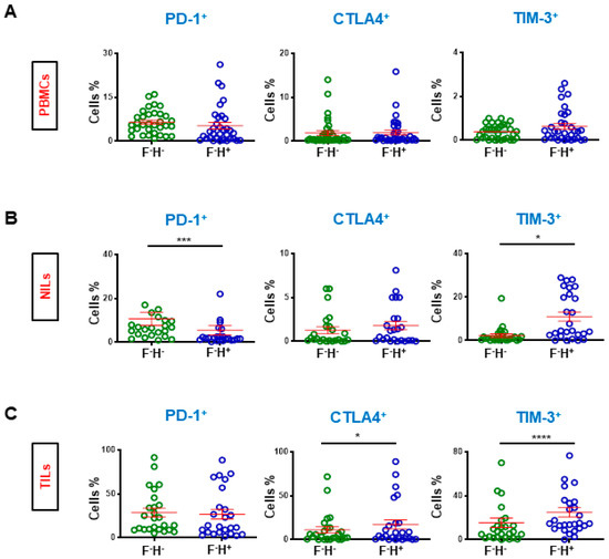Comparison of different immune checkpoint expression on FoxP3−Helios− and FoxP3−Helios+ in CD3+CD4− T cells. Patients were divided based on the expression of Helios. Scatter plots show the differences in levels of immune checkpoint expression on CD8+FoxP3−Helios− and CD8+FoxP3−Helios+ T cells in PBMCs (A), NILs (B), and TILs (C). Statistical analysis are shown with significance levels indicated at * p < 0.05, *** p < 0.001 and **** p < 0.0001.
