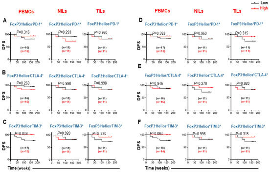 CD8+FoxP3−Helios+PD-1+ and CD8+FoxP3−Helios+CTLA-4+ did not show any associations with DFS in PBMCs, NILs, or TILs (Figure 5D,E). Notably, patients with elevated levels of circulating CD8+FoxP3−Helios+TIM-3+ T cells tended to survive longer than patients with lower levels of these cells (Figure 5F). However, there was no association between levels of CD8+FoxP3−Helios+TIM-3+ and DFS in TILs and NILs (Figure 5F).