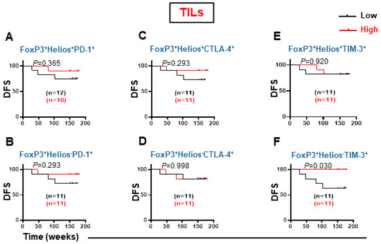 Kaplan–Meier survival curves for DFS based on the levels of FoxP3+Helios+ and CD3+CD4−FoxP3+Helios− CD3+CD4− T cells expressing PD-1, CTLA-4, and TIM-3 in TILs. FoxP3+Helios+PD-1+ (A), FoxP3+Helios−PD-1+ (B), FoxP3+Helios+CTLA-4+ (C), FoxP3+Helios−CTLA-4+ (D), FoxP3+Helios+TIM-3+ (E), and FoxP3+Helios−TIM-3+ (F) cell subsets were grouped into low and high groups, and DFS determined. The number of patients included in each comparison are specified on each survival curve.