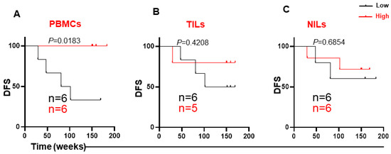 Kaplan–Meier curves of DFS based on levels of CD3+CD4−TIM-3+ in PBMCs, TILs, and NILs in the group of patients with LVI. Patients in the presence of LVI were divided into high and low groups for TIM-3 expression in PBMCs (A), TILs (B), and NILs (C), and DFS was determined for these groups. The number of patients included in each comparison are specified on each survival curve.