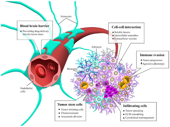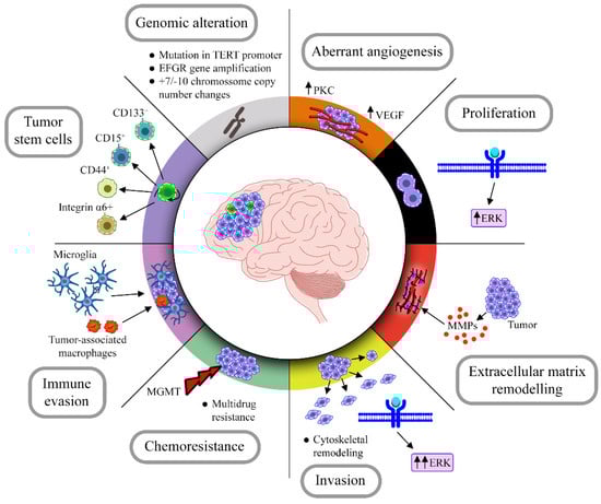 GBM has some characteristics that increase its malignancy leading to a poor prognosis, such as chromosomal aberrations, chemoresistance, high proliferation and intrinsic and extrinsic heterogeneity, caused mainly by subpopulations of tumor stem cells, in addition to being highly infiltrative and modulating the environment around it, recruiting immune cells and modifying the extracellular matrix (Figure 1).