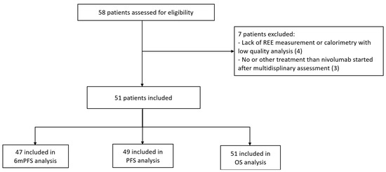 Between October 2015 and September 2020, 58 mRCC patients were included in the CERTIM multidisciplinary assessment before nivolumab treatment, and 51 patients were included in the study cohort (Figure 1).