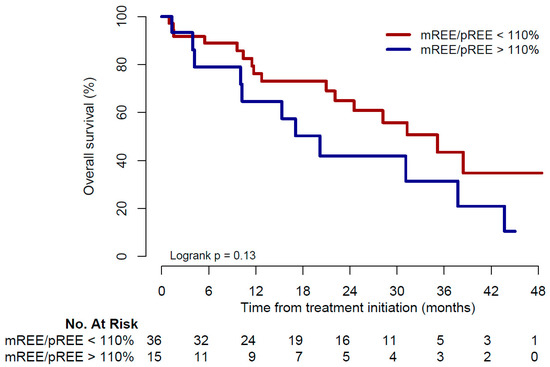 Kaplan–Meier curve for overall survival. mREE: measured resting energy expenditure; pREE: predicted resting energy expenditure.