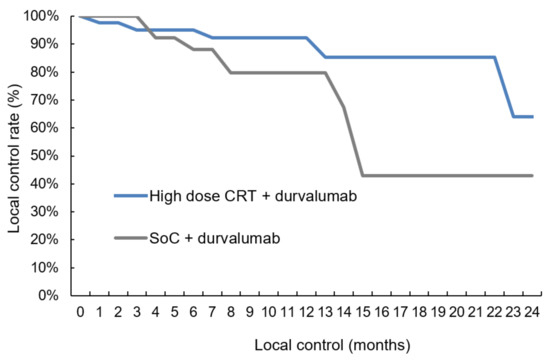 Local control. The comparison showed that local control was tendentially better (log-rank test, p-value = 0.076) in the high-dose chemoradiation group than with SoC treatment: The local control rates at 12 months were 91.8% (Salzburg) versus 79.0% (Vienna), respectively (CRT = chemoradiotherapy, SoC = standard of care).